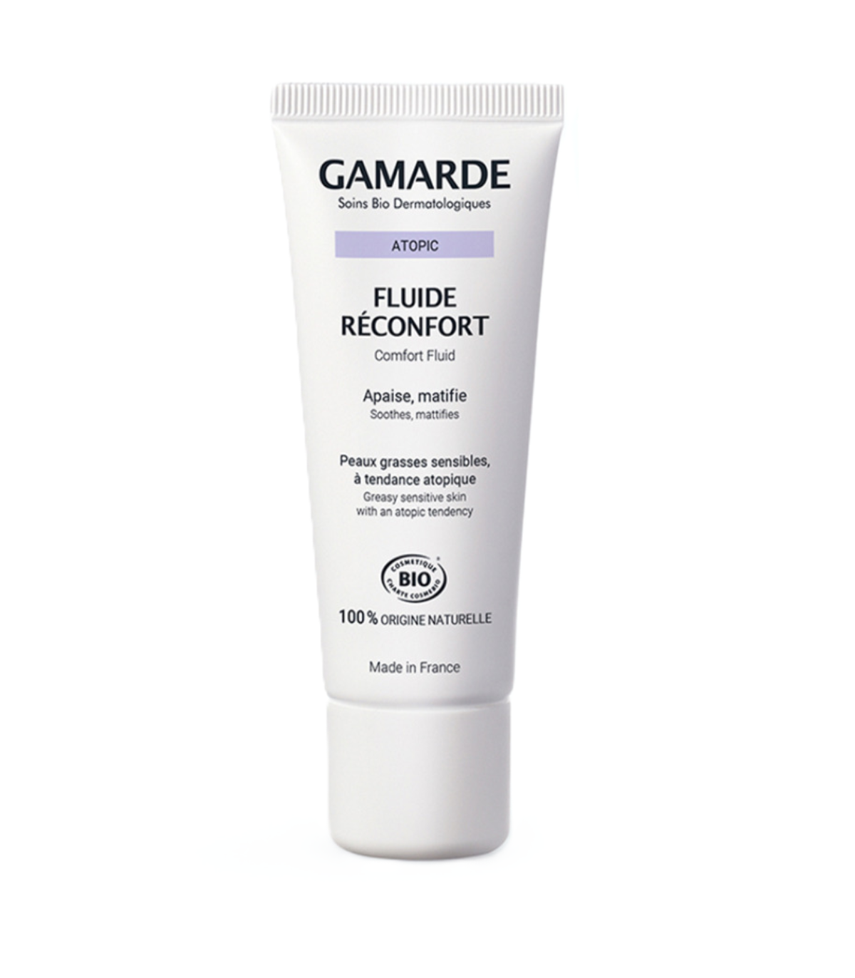 Testé sous contrôle dermatologique, ce fluide, destiné aux peaux sensibles et/ou à tendance atopique plutôt grasses, hydrate, apaise les rougeurs et les sensations d’irritations tout en respectant l’équilibre cutané. La peau est matifiée, soulagée et parait moins réactive. Sans parfum ajouté. Texture fine et fluide