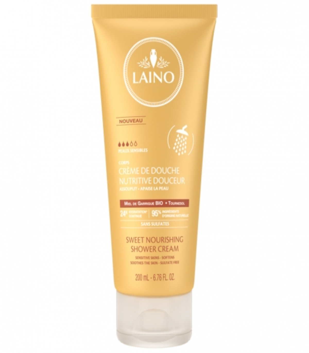 Laino a sélectionné le meilleur des actifs du bassin méditerranéen pour formuler la Crème de Douche Nutritive Douceur à destination des peaux sensibles, Grâce au miel de garrigue BIO et à l'association glycérine et huile de tournesol, cette crème de douche sans sulfates nettoie, assouplit, apaise la peau et l'enveloppe de notes gourmandes et miellées, Hydratation des couches supérieures de l'épiderme,