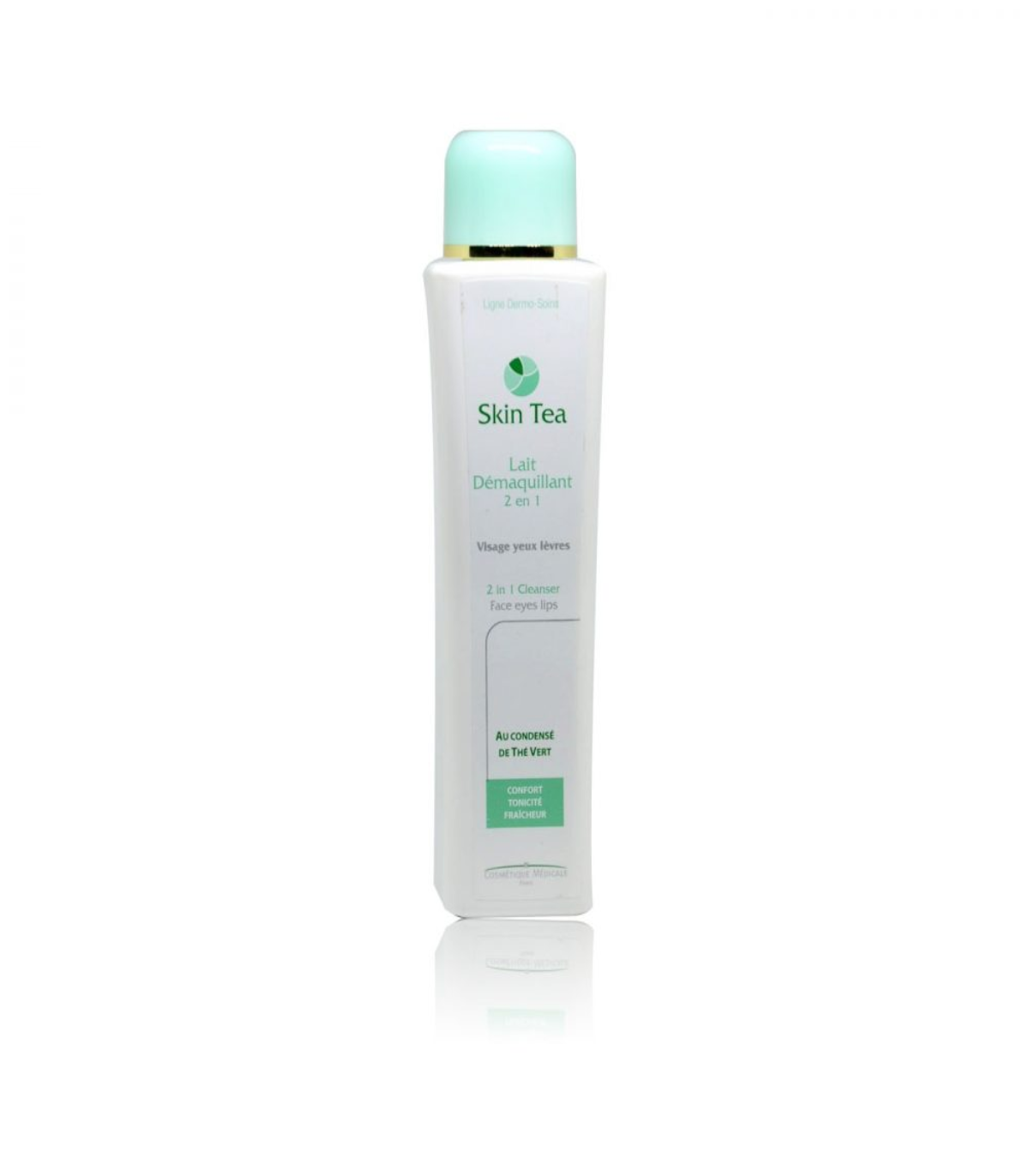 Skin Tea Lait Démaquillant 2 en 1 spécialement formulé pour réunir en un seul produit l'efficacité et la douceur de nettoyage d'un lait et le plaisir de l'eau enrichie en extrait de thé vert pour un effet tonique et rafraichissant,