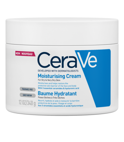 Développé avec des dermatologues, le Baume Hydratant CeraVe nourrit, hydrate et aide à restaurer la barrière protectrice de la peau, Ce soin nourrissant, enrichi aux 3 céramides essentiels et acide hyaluronique hydrate la peau en continu, dès la première application, Sa formule sans parfum convient aux peaux sensibles, Texture baume enveloppante au fini non gras,