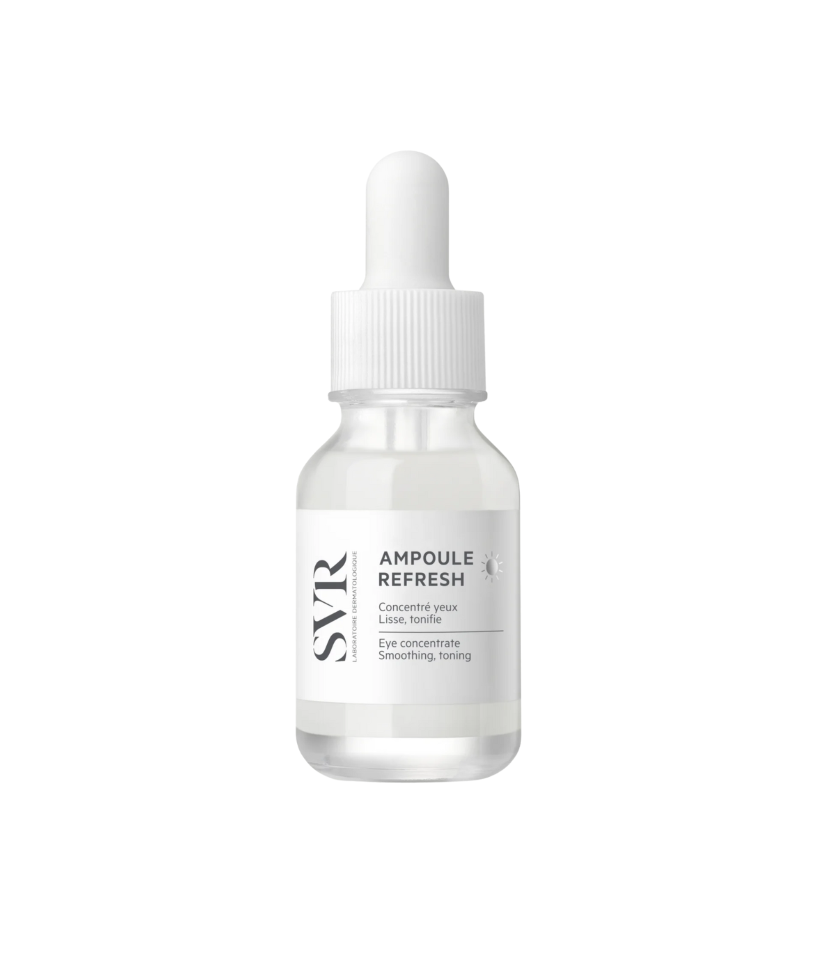 Ampoule Refresh Yeux est un sérum SVR pour le contour des yeux. Sa fraîcheur immédiate réveille le contour de l’oeil. Il atténue les marques de fatigue et lisse les rides et ridules. Son embout métallique amène une sensation fraîche et permet de décongestionner, apaiser et réduire les poches. Enrichi en peptides aux vertus lissantes, en extraits d’algues et en caféine, ce sérum détend les traits, diminue visuellement la couleur des cernes et défatigue le regard.